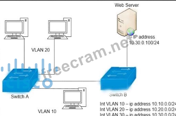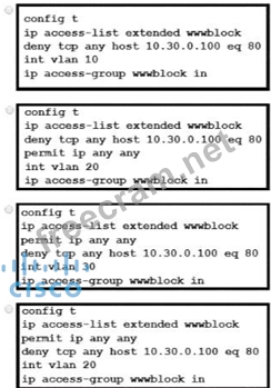A network engineer must block access for all computers on VLAN 20 to the web server via HTTP All other computers must be able to access the web server Which configuration when applied to switch A accomplishes this task?