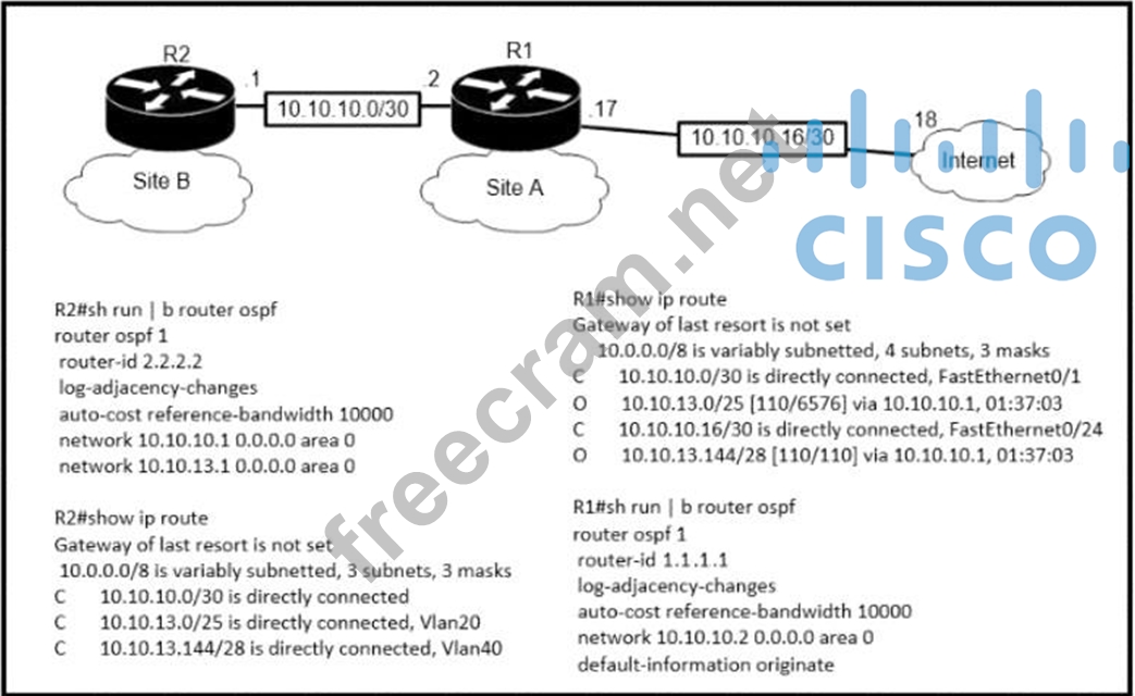 The default-information originate command is configured under the R1 OSPF configuration After testing workstations on VLAN 20 at Site B cannot reach a DNS server on the Internet Which action corrects the configuration issue?