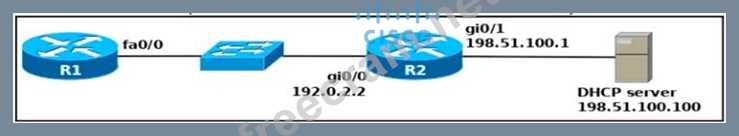 An engineer deploys a topology in which R1 obtains its IP configuration from DHCP. If the switch and DHCP server configurations are complete and correct. Which two sets of commands must be configured on R1 and R2 to complete the task? (Choose two)