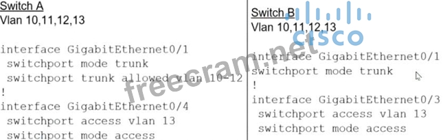 Switch A and Switch B have been partially configured with VLAN 10, 11, 12, and 13. What is the next step in the configuration?