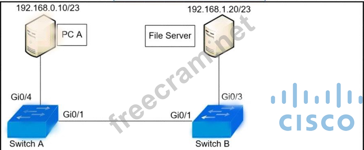 A network administrator assumes a task to complete the connectivity between PC A and the File Server.