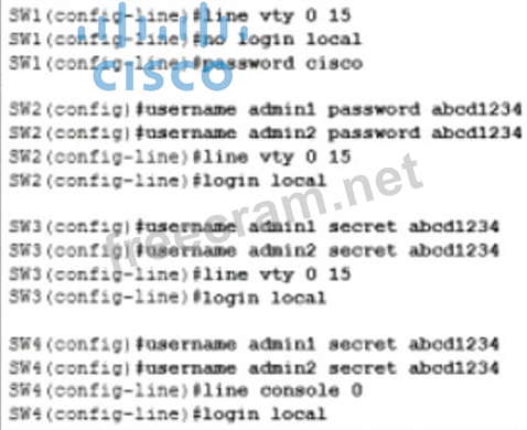 An administrator configures four switches for local authentication using passwords that are stored in a cryptographic hash. The four switches must also support SSH access for administrators to manage the network infrastructure. Which switch is configured correctly to meet these requirements?