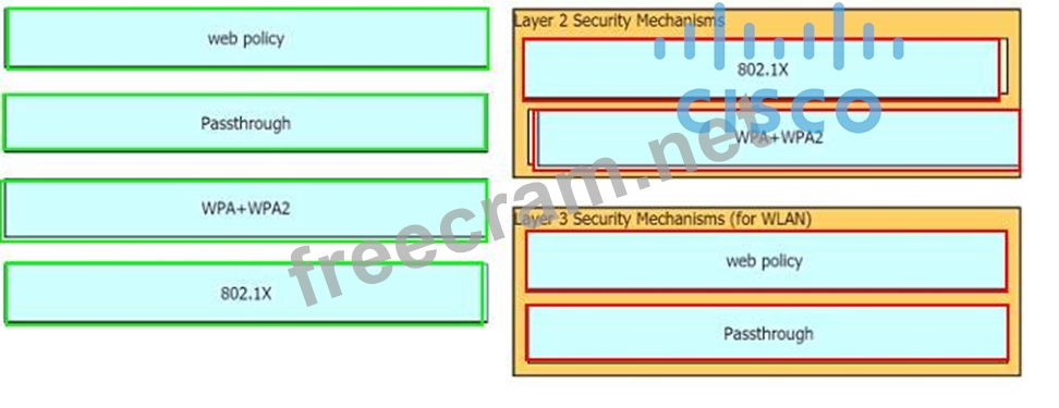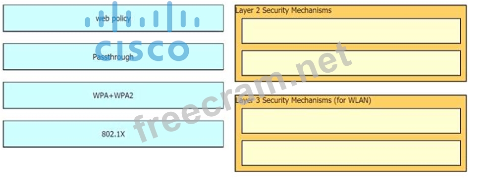 Drag and drop the Cisco Wireless LAN Controller security settings from the left onto the correct security mechanism categories on the right.