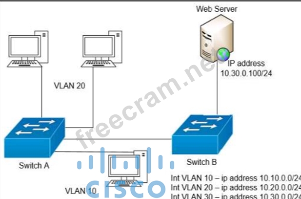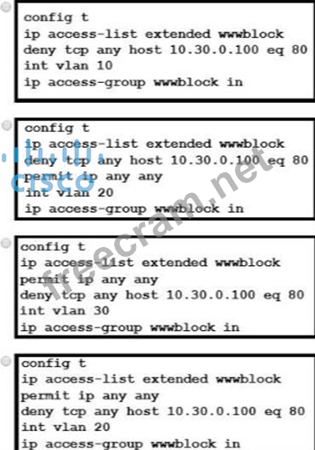 A network engineer must block access for all computers on VLAN 20 to the web server via HTTP All other computers must be able to access the web server Which configuration when applied to switch A accomplishes this task?