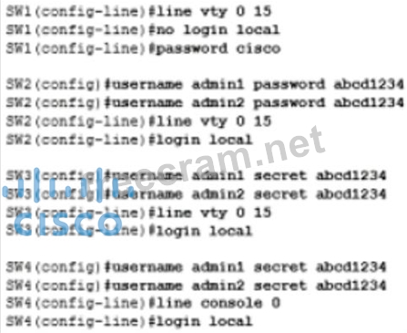 An administrator configures four switches for local authentication using passwords that are stored in a cryptographic hash. The four switches must also support SSH access for administrators to manage the network infrastructure. Which switch is configured correctly to meet these requirements?