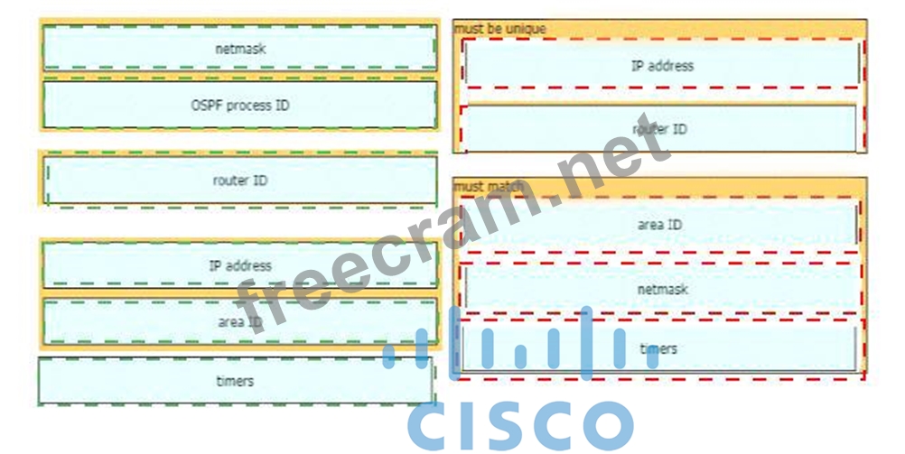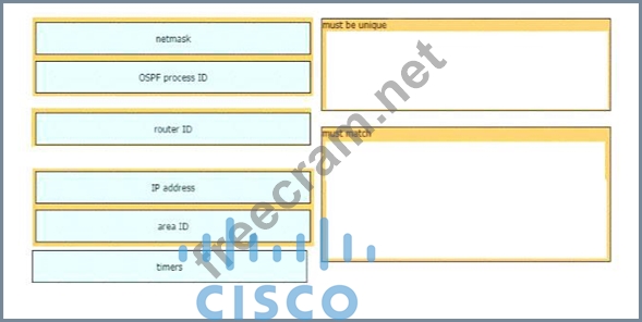 A network engineer is configuring an OSPFv2 neighbor adjacency Drag and drop the parameters from the left onto their required categories on the right. Not all parameters are used