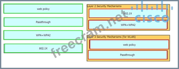 Drag and drop the Cisco Wireless LAN Controller security settings from the left onto the correct security mechanism categories on the right.