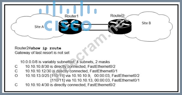 If OSPF is running on this network, how does Router 2 handle traffic from Site B to 10.10.13/25 at Site A?