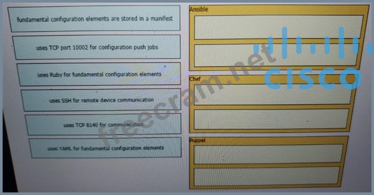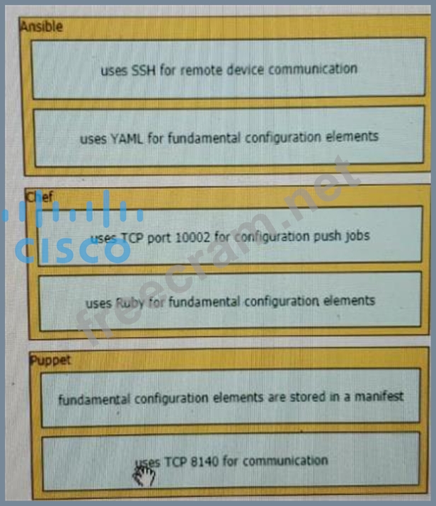 Ansible:- uses SSH for remote device communication- uses YAML for fundamental configuration elements Chef:- uses TCP port 10002 for configuration push jobs- uses Ruby for fundamental configuration elements Puppet:- fundamental configuration elements are stored in a manifest- uses TCP 8140 for communication The focus of Ansible is to be streamlined and fast, and to require no node agent installation.Thus, Ansible performs all functions over SSH. Ansible is built on Python, in contrast to the Ruby foundation of Puppet and Chef.TCP port 10002 is the command port. It may be configured in the Chef Push Jobs configuration file .This port allows Chef Push Jobs clients to communicate with the Chef Push Jobs server.Puppet is an open-source configuration management solution, which is built with Ruby and offers custom Domain Specific Language (DSL) and Embedded Ruby (ERB) templates to create custom Puppet language files, offering a declarative-paradigm programming approach.A Puppet piece of code is called a manifest, and is a file with .pp extension.