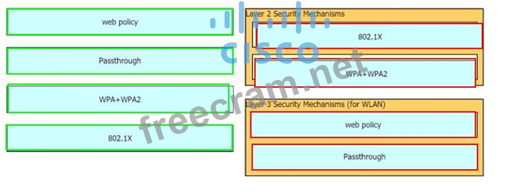 Drag and drop the Cisco Wireless LAN Controller security settings from the left onto the correct security mechanism categories on the right.