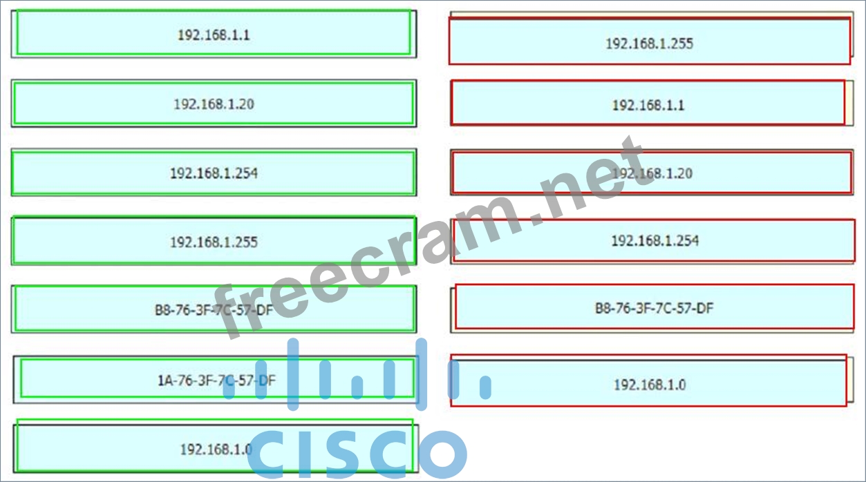 An engineer is required to verify that the network parameters are valid for the users wireless LAN connectivity on a /24 subnet. Drag and drop the values from the left onto the network parameters on the right. Not all values are used.