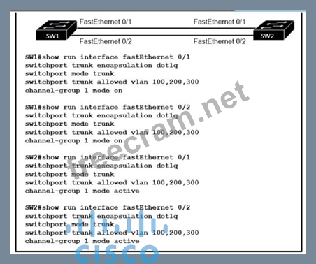 An engineer built a new L2 LACP EtherChannel between SW1 and SW2 and executed these show commands to verify the work. Which additional task allows the two switches to establish an LACP port channel?