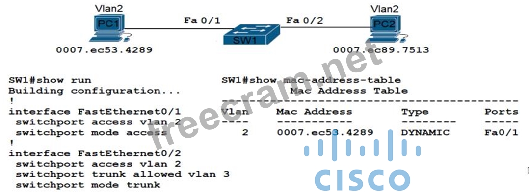 An engineer has started to configure replacement switch SW1. To verify part of the configuration, the engineer issued the commands as shown and noticed that the entry for PC2 is missing. Which change must be applied to SW1 so that PC1 and PC2 communicate normally?
