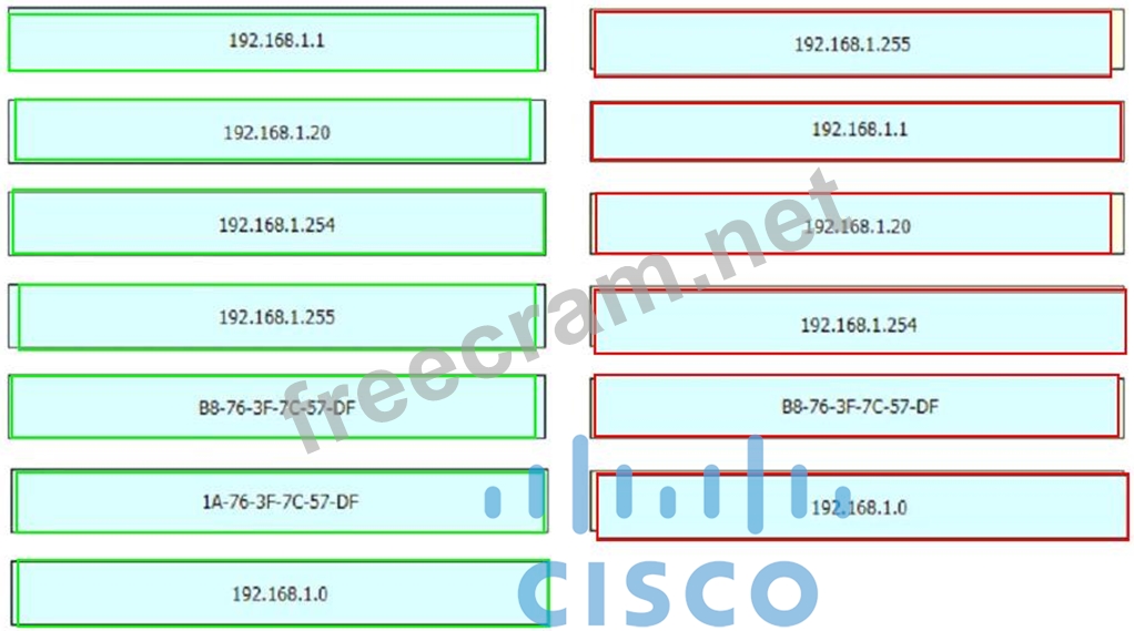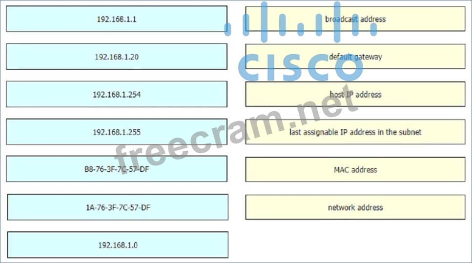An engineer is required to verify that the network parameters are valid for the users wireless LAN connectivity on a /24 subnet. Drag and drop the values from the left onto the network parameters on the right. Not all values are used.