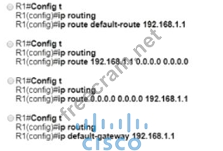 Router R1 must send all traffic without a matching routing-table entry to 192.168.1.1. Which configuration accomplishes this task?