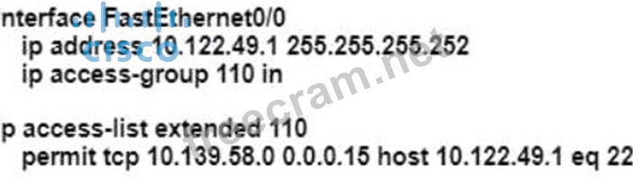 An engineer is configuring remote access to a router from IP subnet 10.139.58.0/28. The domain name, crypto keys, and SSH have been configured. Which configuration enables the traffic on the destination router?