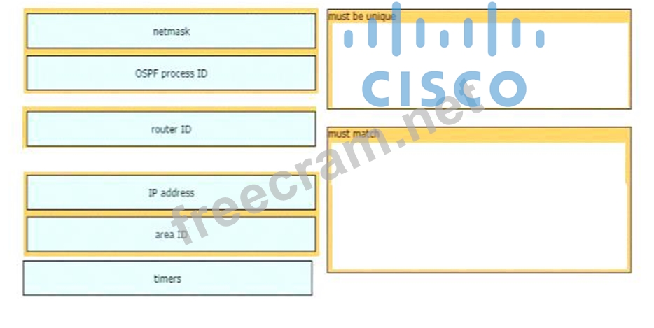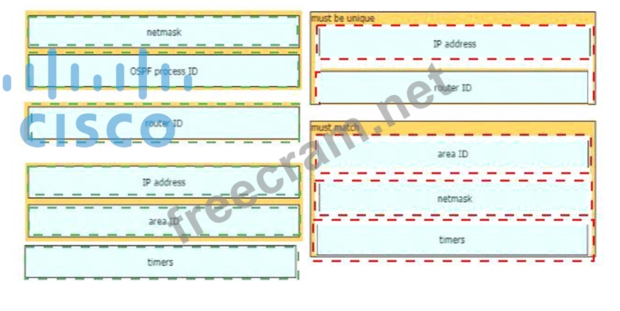 A network engineer is configuring an OSPFv2 neighbor adjacency Drag and drop the parameters from the left onto their required categories on the right. Not all parameters are used