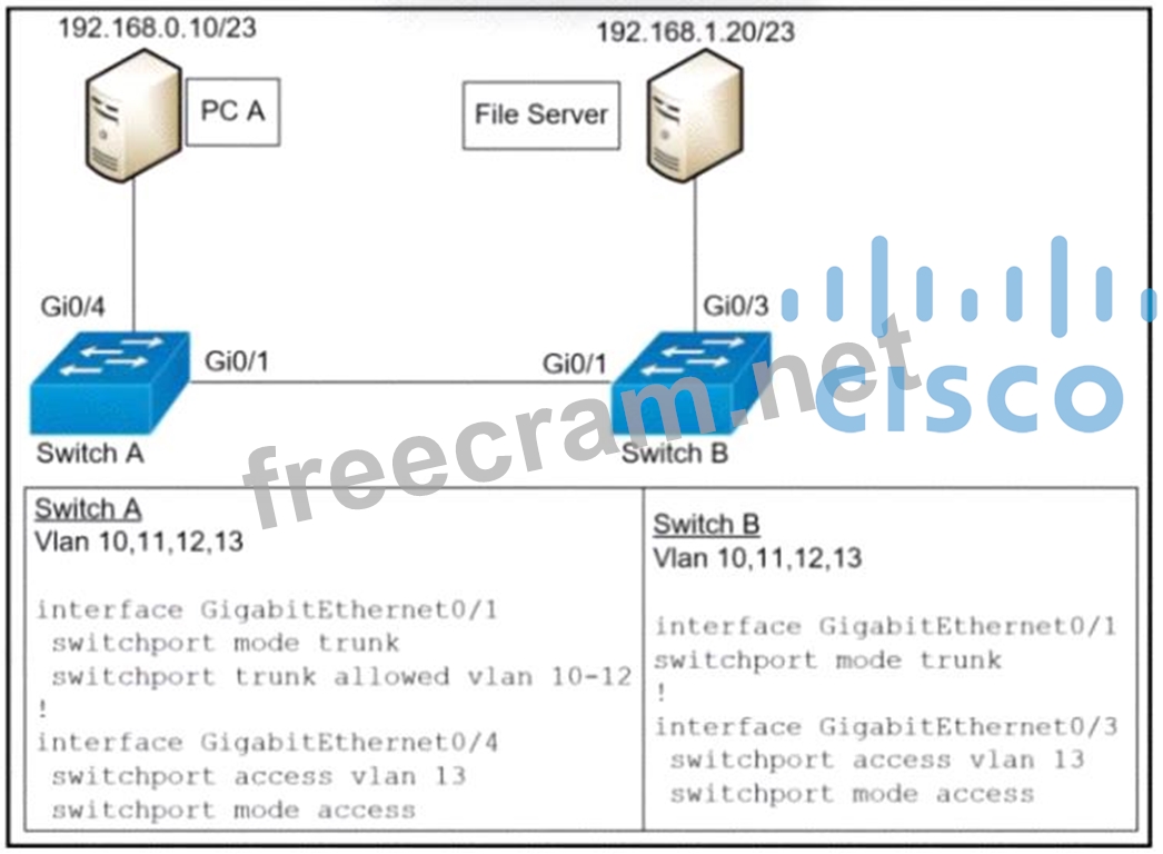 A network engineer must configure communication between PC A and the file server. Which commend must be configured on switch A to prevent interruption of other communications?