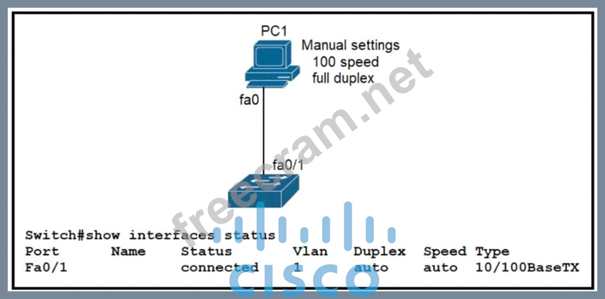 The link between PC1 and the switch is up. but it is performing poorly. Which interface condition is causing the performance problem?