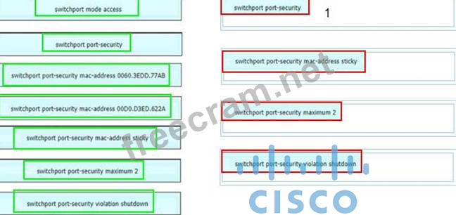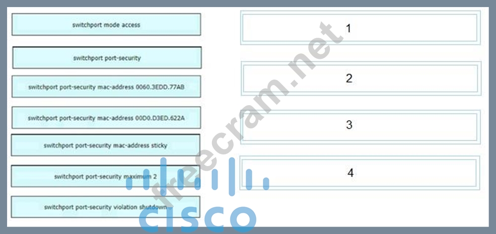 An engineer is tasked to configure a switch with port security to ensure devices that forward unicasts multicasts and broadcasts are unable to flood the port The port must be configured to permit only two random MAC addresses at a time Drag and drop the required configuration commands from the left onto the sequence on the right Not all commands are used.