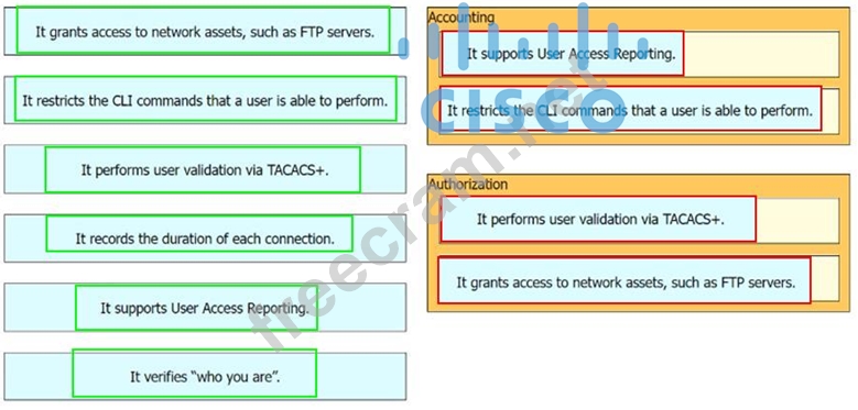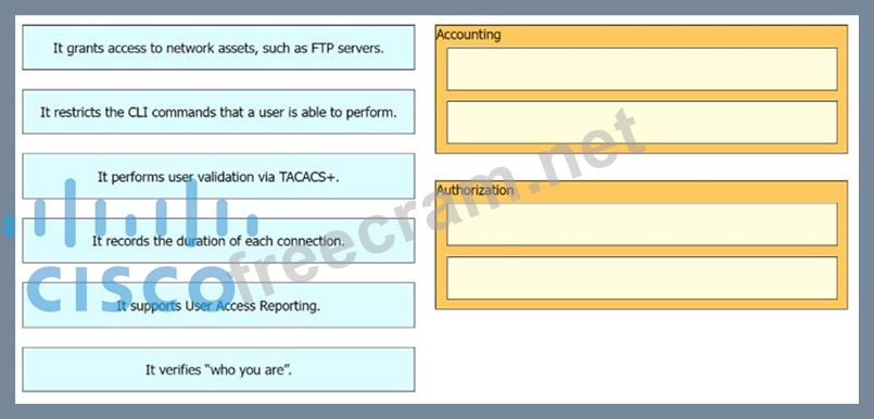 Drag and drop the statement about AAA services from the left to the corresponding AAA services on the right.