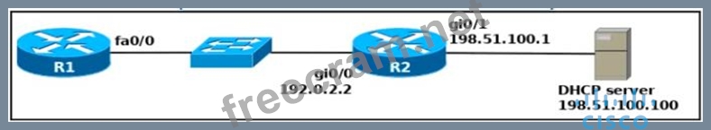 An engineer deploys a topology in which R1 obtains its IP configuration from DHCP. If the switch and DHCP server configurations are complete and correct. Which two sets of commands must be configured on R1 and R2 to complete the task? (Choose two)