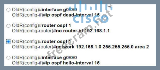 Router OldR is replacing another router on the network with the intention of having OldR and R2 exchange routes_ After the engineer applied the initial OSPF configuration: the routes were still missing on both devices. Which command sequence must be issued before the clear IP ospf process command is entered to enable the neighbor relationship?