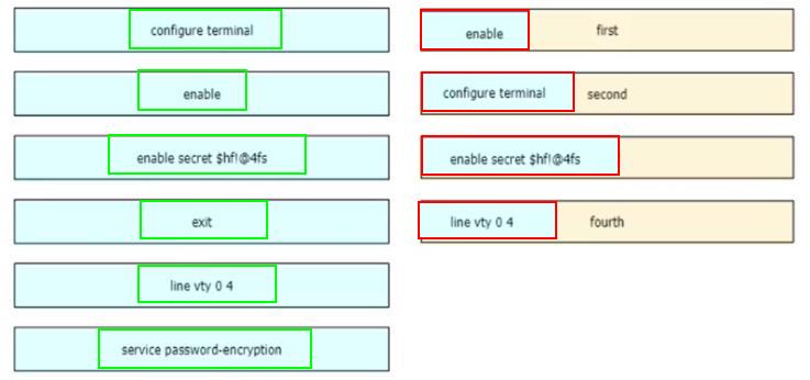 An engineer is configuring an encrypted password for the enable command on a router where the local user database has already been configured Drag and drop the configuration commands from the left into the correct sequence on the right Not all commands are used