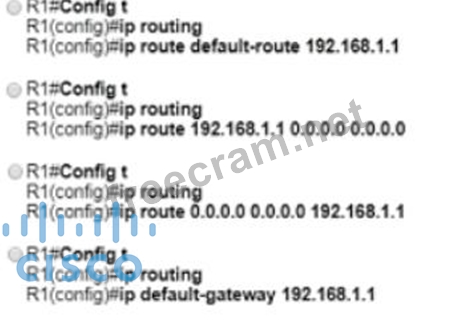 Router R1 must send all traffic without a matching routing-table entry to 192.168.1.1. Which configuration accomplishes this task?