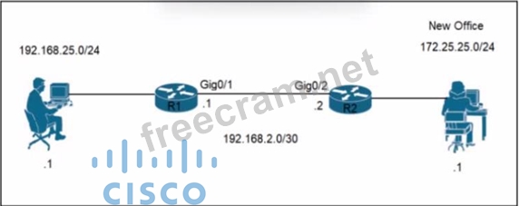 A network engineer is updating the configuration on router R1 to connect a new branch office to the company network R2 has been configured correctly. Which command must the engineer configure so that devices at the new site communicate with the main office?
