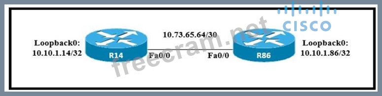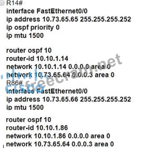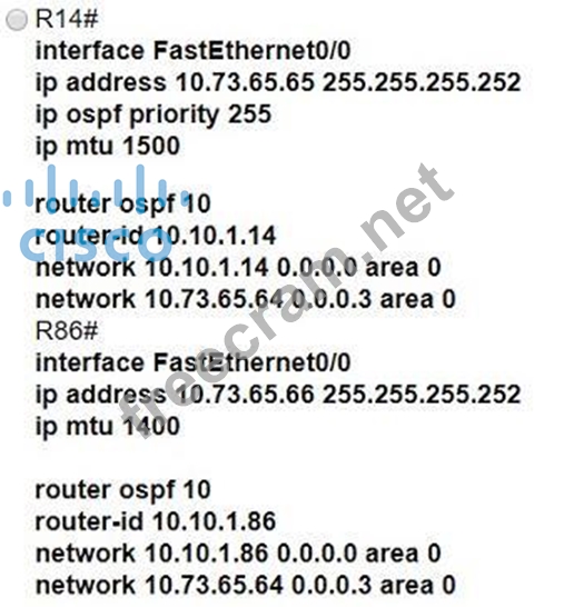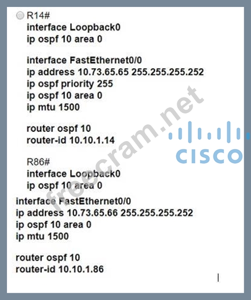 All interfaces are configured with duplex auto and ip ospf network broadcast. Which configuration allows routers R14 and R86 to form an OSPFv2 adjacency and act as a central point for exchanging OSPF information between routers?