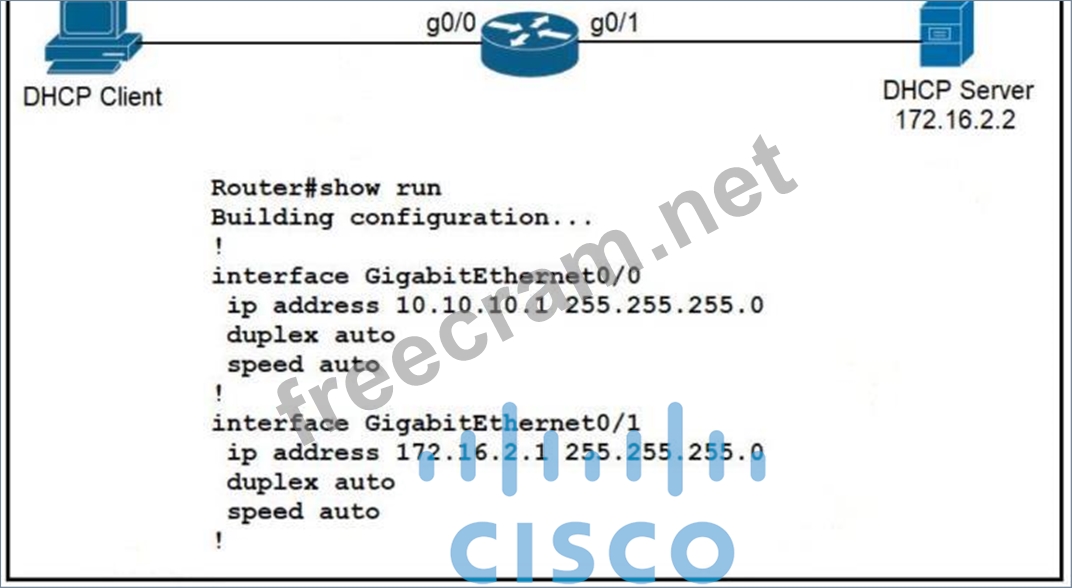 An engineer is configuring a new router on the network and applied this configuration. Which additional configuration allows the PC to obtain its IP address from a DHCP server?