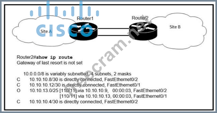If OSPF is running on this network, how does Router 2 handle traffic from Site B to 10.10.13/25 at Site A?