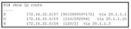 Router R1 is running three different routing protocols. Which route characteristic is used by the router to forward the packet that it receives for destination IP 172.16.32.1?