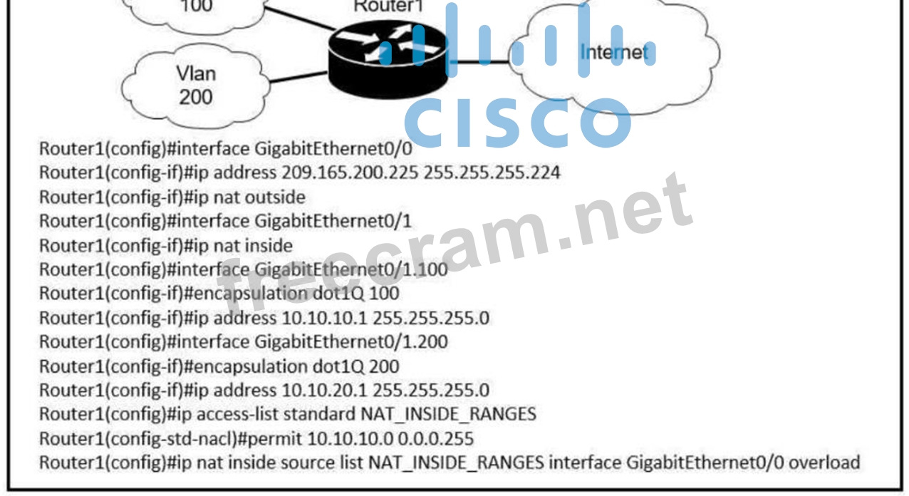 Users on existing VLAN 100 can reach sites on the Internet. Which action must the administrator take to establish connectivity to the Internet for users in VLAN 200?