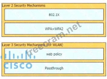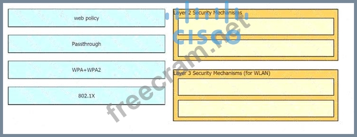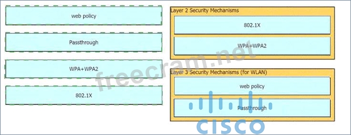 Drag and drop the Cisco Wireless LAN Controller security settings from the left onto the correct security mechanism categories on the right.