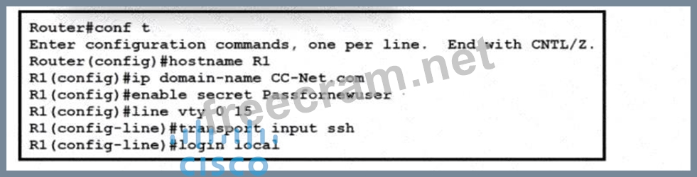 Refer to the exhibit. A network administrator is configuring a router for user access via SSH. The service- password encryption command has been issued. The configuration must meet these requirements: