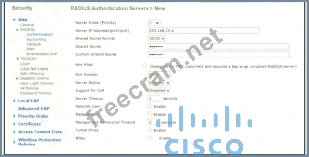 A network engineer configures the Cisco WLC to authenticate local wireless clients against a RADIUS server Which task must be performed to complete the process?