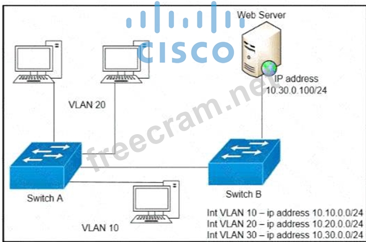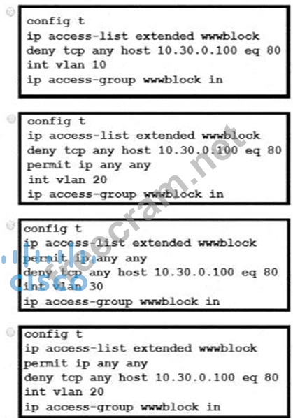 A network engineer must block access for all computers on VLAN 20 to the web server via HTTP All other computers must be able to access the web server Which configuration when applied to switch A accomplishes this task?