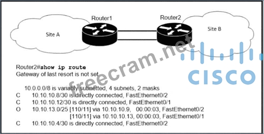 If OSPF Is running on this network, how does Router2 handle traffic from Site B to 10.10.13.128/25 at Site A?