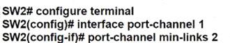 PC1 regularly sends 1800 Mbps of traffic to the server. A network engineer needs to configure the EtherChannel to disable Port Channel 1 between SW1 and SW2 when the Ge0/0 and Ge0/1 ports on SW2 go down. Which configuration must the engineer apply to the switch?