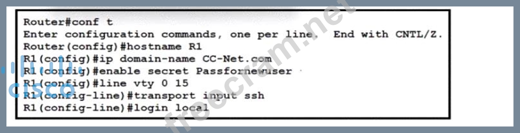 Refer to the exhibit. A network administrator is configuring a router for user access via SSH. The service- password encryption command has been issued. The configuration must meet these requirements: