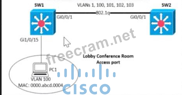 SW1 supports connectivity for a lobby conference room and must be secured. The engineer must limit the connectivity from PCI lo ma SW1 and SW2 network. The MAC addresses allowed must be Limited to two.