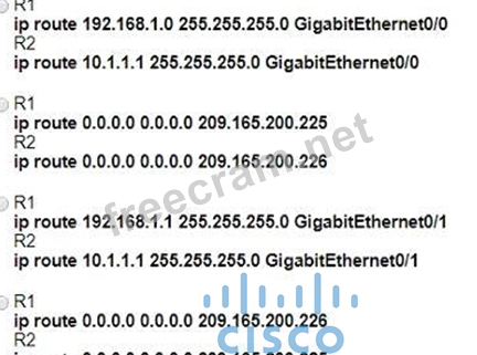 A network engineer is in the process of establishing IP connectivity between two sites. Routers R1 and R2 are partially configured with IP addressing. Both routers have the ability to access devices on their respective LANs. Which command set configures the IP connectivity between devices located on both LANs in each site?