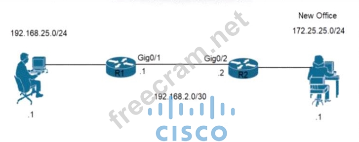 A network engineer is updating the configuration on router R1 to connect a new branch office to the company network R2 has been configured correctly. Which command must the engineer configure so that devices at the new site communicate with the main office?