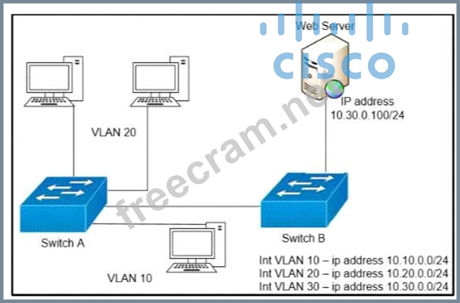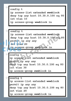 A network engineer must block access for all computers on VLAN 20 to the web server via HTTP All other computers must be able to access the web server Which configuration when applied to switch A accomplishes this task?