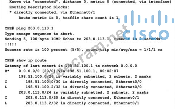 After configuring a new static route on the CPE. the engineer entered this series of commands to verify that the new configuration is operating normally When is the static default route installed into the routing table?