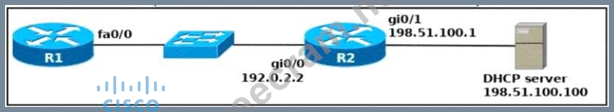 An engineer deploys a topology in which R1 obtains its IP configuration from DHCP. If the switch and DHCP server configurations are complete and correct. Which two sets of commands must be configured on R1 and R2 to complete the task? (Choose two)