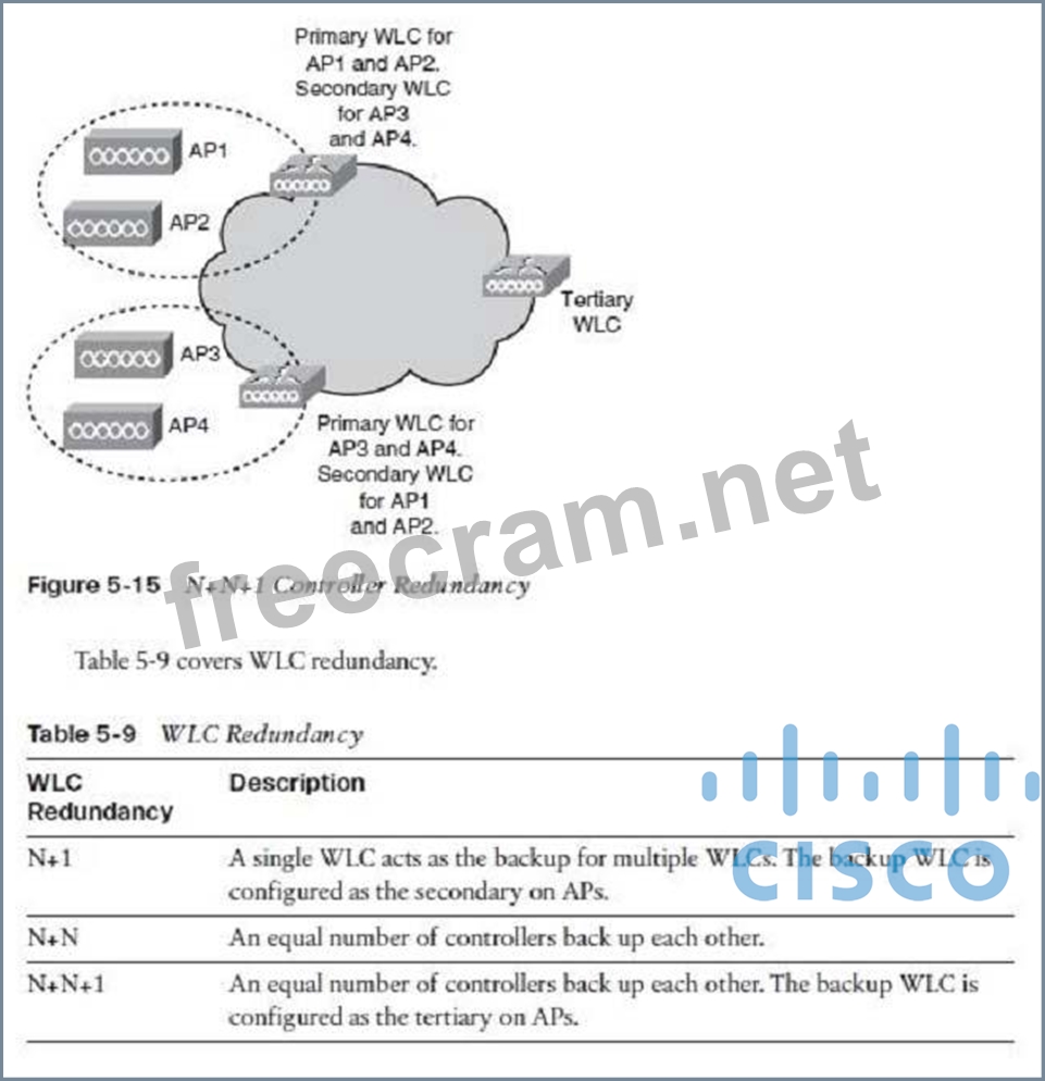 With N+N redundancy, shown in Figure 5-14, an equal number of controllers hack up each other. For example, a pair of WLCs on one floor serves as a backup to a second pair on another floor. The top WLC is primary for API and AP2 and secondary for AP3 and AP4. The bottom WLC is primary for AP3 and AP4 and secondary for API and AP2. There should be enough capacity on each controller to manage a failover situation.