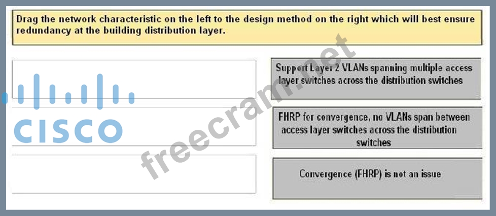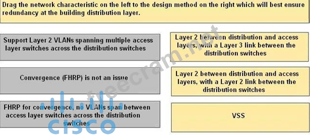 Drag the network characteristic on the left to the design method on the right which will best ensure redundancy at the building distribution layer.